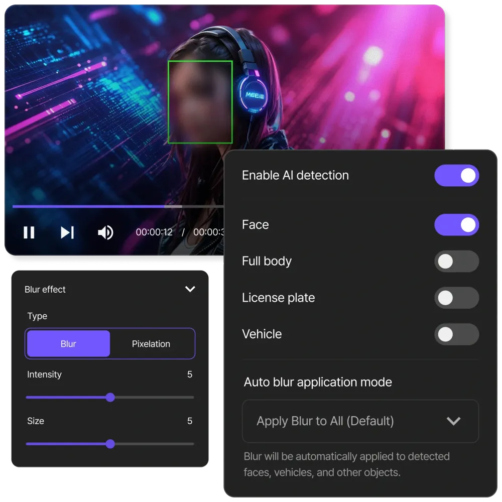 BlurMe uses AI to automatically detect, track and blur faces in video, even when they move. Easily blur someone’s face in a video without manually editing frame by frame.