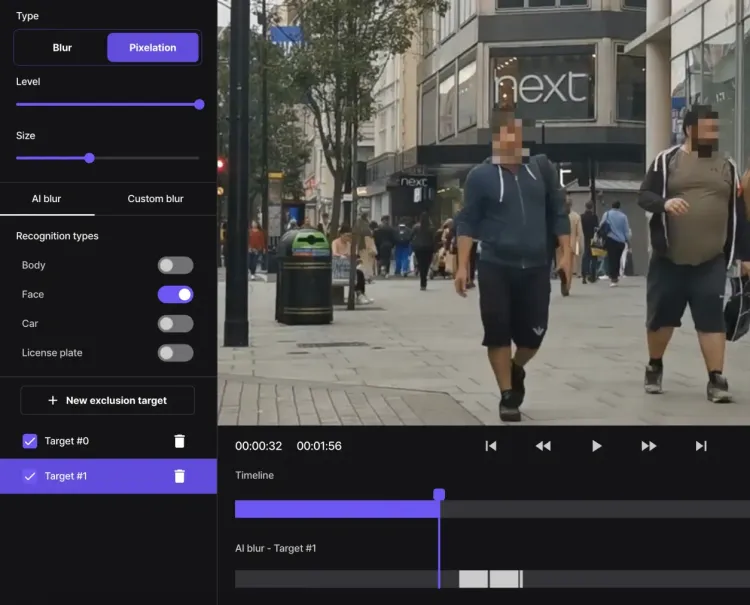 Take full control of how you blur faces in your videos. Choose between different blur and pixelation styles and apply them to any face or area of your video clip. Adjust the intensity of the effect and customize the size as needed.